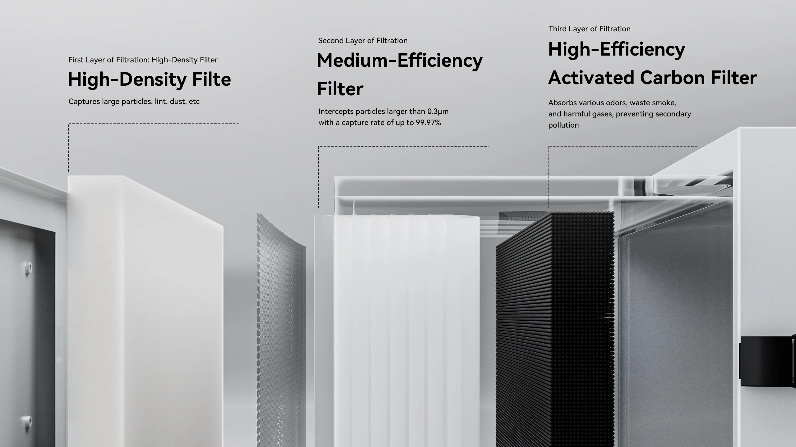 Koristi masivni HEPA H13 kertridž i debeli sloj aktivnog uglja za eliminaciju fine prašine (PM2.5/PM10), iritirajućeg dima i opasnih isparljivih organskih jedinjenja (TVOC, formaldehid).