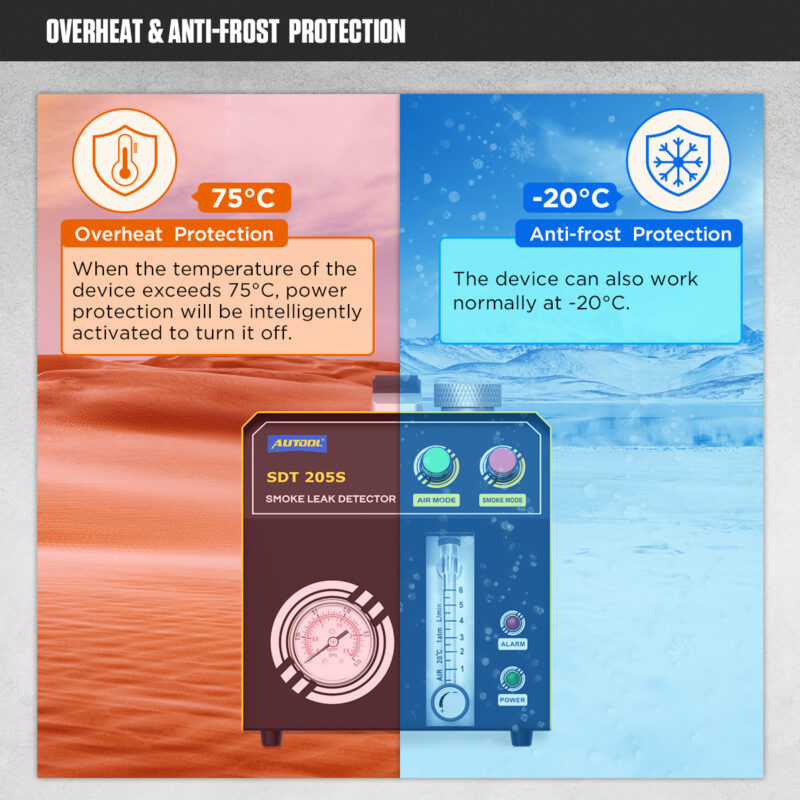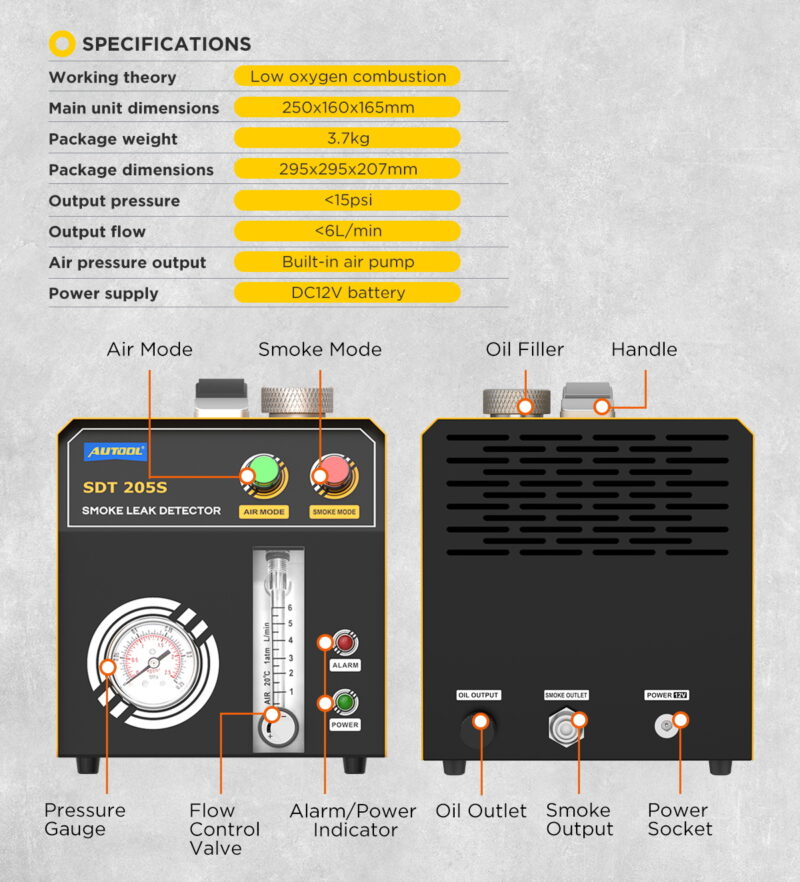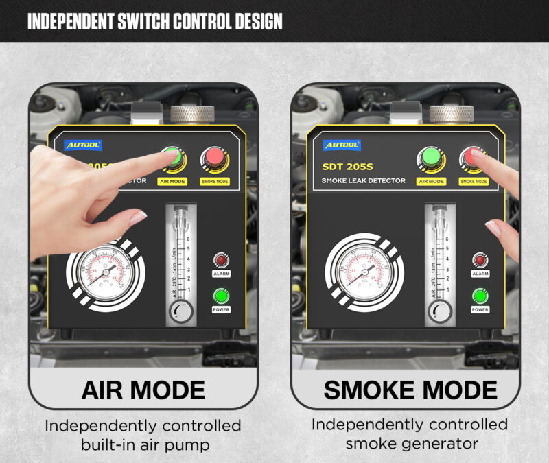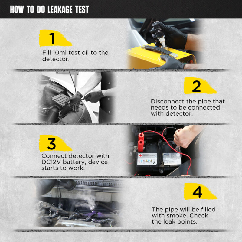SVESTRANA DIJAGNOSTIKA SISTEMAUređaj generiše dim pod optimalnim pritiskom (do 15 PSI / oko 1 bar), što omogućava bezbedno testiranje većine sistema na putničkim, dostavnim vozilima i motociklima. Glavne oblasti testiranja: