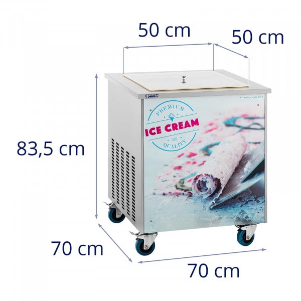 Maszyna do lodów tajskich ma kwadratową płytę chłodzącą o wymiarach 50 x 50 x 2,5 cm. Przygotujesz na niej dużą lub 2 średnie porcje deseru. Dzięki mocy 600 W i wydajnemu kompresorowi profesjonalna maszyna do lodów rolowanych jest szczególnie wydajna. Szybko osiąga żądaną temperaturę i niezawodnie ją utrzymuje.